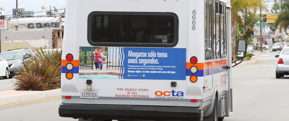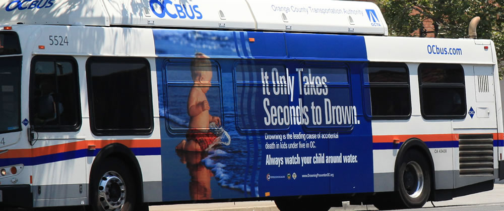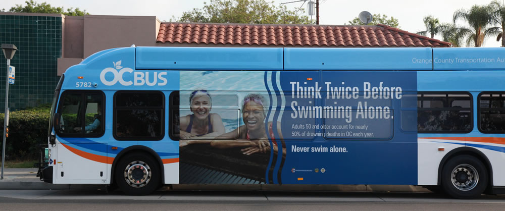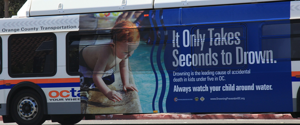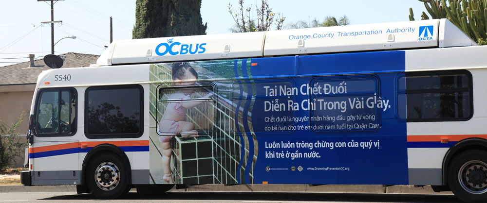 It’s very important to spread the word about drowning prevention to as many people in as many languages as possible across Orange County. Our campaign runs multi-language bus ads throughout the summer months to remind people to always watch their children near water.